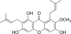 Mangostin is a natural xanthonoid, a type of organic compound isolated from various parts of the mangosteen tree (Garcinia mangostana). It is a yellow crystalline solid with a xanthone core structure.