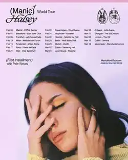 The Manic World Tour was the third headlining concert tour by American singer Halsey, in support of her[a] third studio album, Manic (2020).[1] The tour started in Madrid, Spain on February 6, 2020, and ended in Manchester, England on March 12, 2020, before the COVID-19 pandemic ended the tour abruptly before summer North American and May eastern Asia dates could be played. Originally, Halsey said it would be her last tour for "a very long time".[2][3] The North American leg was originally scheduled to take place in summer 2020, but due to the pandemic, Halsey later announced that she had rescheduled the North American leg to summer 2021.[4]