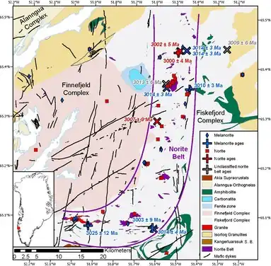 - ^ Secher (1983). "Noritic rocks and associated nickel-copper-sulphide occurrences in Sukkertoppen district, central West Greenland". The Geological Survey of Greenland Reports. 115: 30–34 – via GEUS.