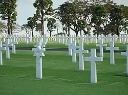 The cemetery, 152 acres or 620,000 square meters in area, is located on a prominent plateau, visible at a distance from the east, south and west.[1] With a total of 17,206 graves, it has the largest number of graves of any cemetery for U.S. personnel killed during World War II and holds war dead from the Philippines and other allied nations.[1] Many of the personnel whose remains are interred or represented were killed in New Guinea, or during the 1941–42 Battle of the Philippines or the Allied recapture of the islands.[1] The headstones are made of marble which are aligned in eleven plots forming a generally circular pattern, set among a wide variety of tropical trees and shrubbery.[1] The Memorial is maintained by the American Battle Monuments Commission.