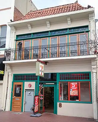 The Manila Cafe is an historic structure located at 515 5th Avenue in San Diego's Gaslamp Quarter, in the U.S. state of California.[1] It was built in 1930, and has housed several restaurants since then, including but not limited to, the Mandarin Cafe (1931 to 1933), Owl Hotel, and Kid Jerome Billiard Hall (1940 to 1943).[2] In 2014, a new tenant took over the building and made modifications to the exterior. However, the upper story and its distinctive roof remain intact.[2] Several businesses currently occupy the space, including a 7-Eleven, Fident Capital, and Gbod Hospitality Group.