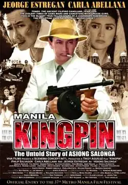 Manila Kingpin: The Untold Story of Asiong Salonga (also marketed as Manila Kingpin: The Asiong Salonga Story) is a 2011 Filipino biographical-crime film directed by Tikoy Aguiluz and Darryl "Gary" dela Cruz[2] and starring Jeorge "E.R." Estregan in the title role, alongside Carla Abellana, Phillip Salvador, John Regala, Ronnie Lazaro, Baron Geisler, Joko Diaz, Archie Adamos, Yul Servo, Dennis Padilla, and Ketchup Eusebio. Produced by Scenema Concept International, it was released by Viva Films as an entry to the 37th Metro Manila Film Festival, where it won 11 awards, including for Best Picture, Best Director (dela Cruz), and Best Actor (Estregan).[3]