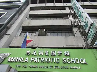 Manila Patriotic School (Chinese: 马尼剌爱国中学[2]) is a Cantonese-established Chinese school that offers Mandarin classes, located in No. 701 T. Mapua Street, Santa Cruz, Manila, Philippines. It was founded in November 1912, and is recognized as second of the oldest Filipino Chinese schools in Binondo, Manila next to Tiong Se Academy. Private, non-sectarian and funded by alumni association of the school. In November 2024, the school celebrate 112th founding Anniversary and third oldest Filipino Chinese school in the Philippines next to Hua Siong College of Iloilo (formerly Iloilo Central Commercial High School). Its sister school is the Baguio Patriotic High School.