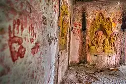 In the outer wall of another of these cells there have been a standing (Kayotsarga) and a sitting figure of Tirthankara, but these are now almost obliterated.[12][3]
