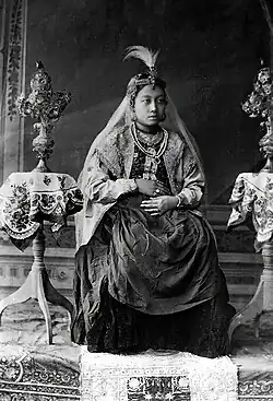Maharani Khuman Chanu Manmohini Devi was the niece and third Maharani consort of Tripura through her marriage to Maharaja Birchandra Manikya. She was one of the Meitei queens of Tripura.[1] She was a contemporary royal photographer who choreographed her self-portraits with the Maharaja,[2] and was considered the first Indian woman who mastered the art of photography.[3][4][5][6]