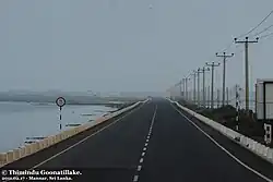 Mannar Island (/məˈnɑːr/ mə-NAR; Tamil: மன்னார் தீவு, romanized: Maṉṉār tīvu; Sinhala: මන්නාරම් දූපත, romanized: Mannāram dūpata), formerly spelt Manar Island, which lies off the north-western coast of Sri Lanka, is part of Mannar District, Sri Lanka. It is linked to the main island of Sri Lanka by a causeway and the Mannar Bridge, which carries the A14 highway, and a railway bridge. It has an area of about 130 square kilometres (50 sq mi), mainly covered with vegetation and sand.