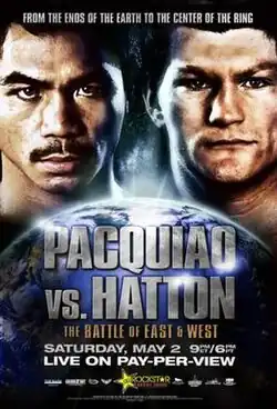 Manny Pacquiao vs. Ricky Hatton, billed as The Battle of East and West, was a professional boxing match for the IBO and The Ring light welterweight championship between Manny Pacquiao of General Santos, Philippines and Ricky Hatton of Manchester, United Kingdom. The bout was held on 2 May 2009 at the MGM Grand in Las Vegas, Nevada, United States and drew 1.75 million pay-per-view buys.[1]