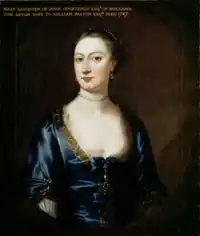Mary Courtenay (bapt.1/2/1687, died 1747),[69] married in 1725 William Paston (died 1769)[70] of Horton Court near Chipping Sodbury, Gloucestershire. Mary Courtenay was said by the Antiquary Thomas Hearne (died 1735) to have been "a lady of great understanding and virtue".[71] There is a monument to William Paston (died 1769) in Horton Church, where both he and his wife Mary Courtenay were buried. Their daughter Anne Maria Paston (born at Horton 22 January 1728),[72] who was also a co-heiress of Thomas Arundell, 4th Baron Arundell of Wardour (1633–1712), married Sir George Throckmorton (1721–1767), only son of Sir Robert Throckmorton, 4th Baronet (died 1791), whom he predeceased. Molland manor thus passed into the Throckmorton family.