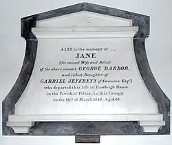 Jane Jeffreys (1779–1845), "Mrs Barbor", the widow of George Barbor (1756–1817) of Fremington House, about three miles (5 km) west of Barnstaple, was resident at "Rawleigh House" from at the latest 1830[27][28] until her death in 1845 as is recorded on her mural monument in Fremington Church.