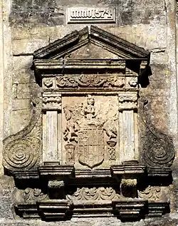 The later heir of the FitzWarins was the Bourchier family, Earls of Bath and Barons FitzWarin, who made Tawstock their seat and were highly influential in Barnstaple society and politics. They also inherited via the Audleys other manors formerly part of the barony of Barnstaple, including Nymet Tracy,[42] St Marychurch,[43] Kingston,[44] Marwood[45] and Upexe.[46] Another manor which descended from the Audleys was Holne on the River Dart, which was later used as a hunting estate ("Holne Chase") by the Wreys.[47] Their 17th century landholdings in total comprised 36 manors in the counties of Devon, Cornwall, Somerset, Gloucestershire, Wiltshire and Berkshire.[48] The Bourchier Barnstaple townhouse is thought to survive as no. 62 Boutport Street,[49] with its surviving ornate plaster barrel-ceilings dated 1620 (or 1629[50]), showing the arms of Bourchier,[50] which survives next to the Royal and Fortescue Hotel, and was converted in about 1760 to premises of the "Golden Lion" coaching inn.[51] It was converted to premises for the National Westminster Bank in 1936,[50] in 1991 housed a branch of the Woolwich Building Society[52] and in 2014 is a restaurant. The Bourchier family, the Devon branch of which, seated at Tawstock Court, was later created Earls of Bath, retained the manor of Bampton until at least the time of Risdon (died 1640) who states in his Survey of Devon that "the Earl of Bath is lord of this manor".[53] The descent of Bampton was as follows: