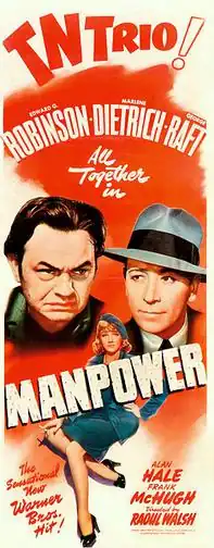 Manpower is a 1941 American crime melodrama directed by Raoul Walsh and starring Edward G. Robinson, Marlene Dietrich, and George Raft. The picture was written by Richard Macaulay and Jerry Wald, and the supporting cast features Alan Hale, Frank McHugh, Eve Arden, Barton MacLane, Ward Bond and Walter Catlett.