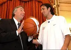 Among Ginóbili’s achievements include leading Argentina to a gold medal at the 2004 Summer Olympics, where he was named FIBA Olympics Most Valuable Player. He also helped secure the historic feat of being the only team to ever eliminate the United States basketball team in Olympic history (as of 2025).[23] With this victory, Ginóbili became one of only two players (along with fellow Hall of Famer Bill Bradley) to have won a EuroLeague title, an NBA championship, and an Olympic gold medal.[24]