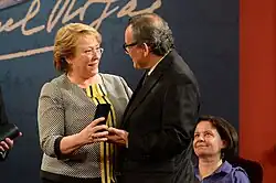 ![]() Horacio Castellanos Moya receiving the award in 2014, at the hands of President Michelle Bachelet | |