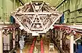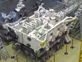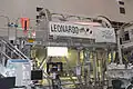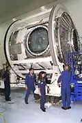 At the SSPF, ISS modules, trusses and solar arrays are prepped and made ready for launch. In this iconic building are two large 100,000 class clean work environment areas.[27] Workers and engineers wear full non-contaminant clothing while working. Modules receive cleaning and polishing, and some areas are temporarily disassembled for the installation of cables, electrical systems and plumbing. Steel truss parts and module panels are assembled together with screws, bolts and connectors, some with insulation. In another area, shipments of spare materials are available for installation. International Standard Payload Rack frames are assembled and welded together, allowing the installation of instruments, machines and science experiment boxes to be fitted. Once racks are fully assembled, they are hoisted by a special manually operated robotic crane and carefully maneuvered into place inside the space station modules. Each rack weighs from 700 to 1,100 kg, and connect inside the module on special mounts with screws and latches.[28]