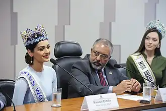Chhillar reached Brazil in continuation of her humanitarian tour. She visited the Government Palace in the State of São Paulo, where the First Lady of the State, Professor Lucia Franca discussed various social projects supported by the state with Chhillar.[69] She initiated an awareness program to prevent and fight against leprosy.[70] According to Chhillar, the aim was to teach people about the early signs of the disease and the ways to seek treatment.[71] She also met and interacted with the children from the APAE, an organisation that primarily works towards the welfare of children suffering from Down syndrome.[72] She gave a presentation on behalf of the organisation to the Governor of the Federal District of Brasília, Rodrigo Rollemberg, at the Charity Gala arranged by APAE.[73] She highlighted the works done by the organisation and requested the Governor to help build a new third floor to the APAE building, so that all the children with Down Syndrome in the state could be helped.[72][74][75] She was invited by Foreign Affairs Chairman, Congressman Nielson Pinto and the National Defense Committee, and was honoured by the Parliament of Brazil for her humanitarian works.[72]