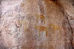 The Manyana Rock Paintings are a collection of rock art and caves located at the Kolobeng hills, neighbouring Manyana, Southern District, Botswana. It is believed that the artworks were made by the Khoikhoi or the San people between 1100 AD and 1700 AD.[1] The paintings are found on five cliff areas around the rocky hill.[2] Today, the site is fenced and protected as a National Monument.[3][4]