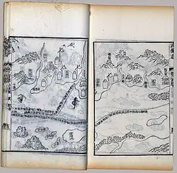 The map was originally in the form of a strip map of 20.5 cm by 560 cm that could be rolled up, but was then divided into 40 pages in the book. The map, after Nanjing and the Yangtze River, shows mainly the coastal regions and islands along the sea route, and places are depicted in their approximate positions along the contour of the coast. The coast of the main land mass is shown largely as a continuous irregular line at the top of the map, with deep V-shaped indentations indicating river estuaries. As a result of the nature of the map and its focus on the coastal region, the shape of the Malay Peninsula cannot be distinguished, and India became elongated as its interior is omitted. Pages of the map are arranged from right to left in traditional Chinese book format, starting from Nanjing and finishing in Hormuz.[1] Places in East Africa such as Socotra, Mogadishu and Malindi appear in sequence from left to right on the coast of Africa which is shown as a continuous land mass at the bottom of the sections for India and Sri Lanka.[11]