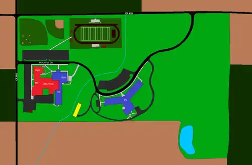 All three of the Mapleton buildings are located on one campus at the southeast corner of County Roads 801 and 620, about 3 miles north of Nankin, Ohio.[7] Mountie Drive runs through campus and connects CR 801 with CR 620 after winding by all three buildings. Despite Mountie Drive serving as the mailing address for the high school[8] and the elementary school,[9] the middle school still uses CR 801 for its address.[10]