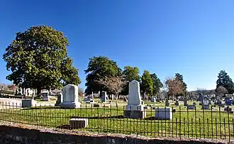The first person to be buried in Old Maplewood was Robert H. Watkins, a planter.[2] The black burials are unmarked, while the white burials are often adorned with sculptures of angels and obelisks.[2] There is a sub-section for the 85 veterans of the Confederate States Army buried there, including a monument dedicated by the United Daughters of the Confederacy in 1913.[2] Other burials include Masons, and 40 veterans of the United States Colored Troops.[2]