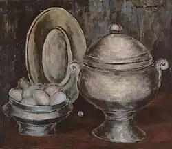 Classified by some as a surrealist painter, María Izquierdo never identified herself as a surrealist. Instead, Izquierdo identified with the Contemporáneos, who believed that Mexican culture should be rightfully seen as a vital contributor to the dominant Western culture. She wasn't afraid to go against popular Mexican art movements and follow her own style of painting. Her culture as a mestiza was an essential part of her artistic style and themes used in her work.[7] Izquierdo was celebrated as an artist with a genuine understanding of native and rural traditions, and her altar paintings were recognized at the time for "their delightful indigenous ingenuousness."[13] Her naive painterly technique, intended to recall the folk painting of regional artisans, heightened the effect.[13] Still, many of her paintings contain unusual subject matters and interesting juxtapositions.[13] Izquierdo's peculiar inclusion into a Mexican nationalist discourse suggest ways of bringing together several sets of discourses too often kept separate: those of Latin America, of feminism, of modernism, and of nationalism.[13] Still, many of her paintings contain unusual subject matters and interesting juxtapositions. Known for her use of bold, rich, and bright colors, most of Izquierdo's paintings were done using oil paints or watercolor.[3] Although she was and is still often compared to Frida Kahlo because both woman launched their careers at similar times, the two have very individual styles. At the beginning she would paint still life and portraits. She experimented with many different styles and techniques; such as, oil painting, watercolor, still life, and landscape.[14]