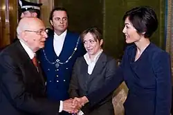 Carfagna entered politics in 2004,[9] and became responsible for the women's movement in the political party Forza Italia.[4][10] In the elections of 2006 she was elected into the Chamber of Deputies for Forza Italia, and in the 2008 elections – running as the third candidate from The People of Freedom in the district "Campania 2" – she was reelected.[11] When she first entered parliament Berlusconi jokingly commented that Forza Italia practiced the law of primae noctis; the right of a feudal lord to take the virginity of his female subjects.[12] As a deputy she was secretary of the Commission for Constitutional Affairs,[4] and has been described as a diligent, hard-working parliamentarian.[13] On 8 May 2008 she was appointed Minister for Equal Opportunity,[14] in the fourth cabinet of Silvio Berlusconi, an appointment that was widely publicised internationally, with focus on her special background.[5][15]