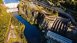 The powerhouse was constructed rapidly to have the machines operating as soon as possible. The foundations were started in early 1950, and the powerhouse was completed within a year. It consisted of a steel structural frame with a pre-cast concrete sectional roof. The transformer station was placed at the back and on top of the powerhouse itself due to the confines of the gorge.[1][2]