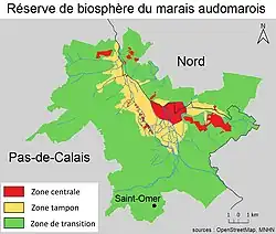 The Marais Audomarois (French pronunciation: [maʁɛ odɔmaʁwa]) is a wetland biosphere reserve in the north of France. The renowned Ramsar site covers some 22 300 hectares, including the city of Saint-Omer.