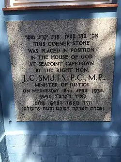 The architect, J Lonstein was hired to design a new synagogue for the congregation and the building was completed in 1934, with Jan Smuts laying the cornerstone on April 18.[3] The building is octagonal in shape and it was the first purpose-built synagogue on the Atlantic seaboard and was built to accommodate over nine hundred people.[3] It was originally fitted with hard wood seating (upholstered in red leather), an Aron Kodesh panelled in teak and lighting that took the form of fluorescent tubes in the shape of a Magen David.[4] The building was officially opened in September 1934 by Cape Town's Jewish mayor, Louis Gradner and it was consecrated by Rev. AP Bender, spiritual leader of Gardens Shul.[5][4] Rev. P Rosenberg was the first spiritual leader of the newly built synagogue.[4]