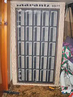 HD77 is a model name of Marantz 4-way high-fidelity loudspeakers produced during the mid-1970s. They were bass reflex speakers but came with a cylindrical piece of foam which fit into the bass-reflex port of the enclosure, allowing listeners to achieve more accurate bass response similar to that of airtight speaker boxes. Although this configuration wasn’t fully airtight in theory— technically considered aperiodic—the plug used was actually made of closed-cell foam, which did seal the cabinet completely. The plug was cut slightly larger than the port opening, and when inserted and tightened with a retainer screw, it compressed to create an airtight seal, effectively converting the speaker into an acoustic suspension type.