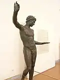 - ^ The unusual stance was noted by Gisela Richter, "The Hermes of Praxiteles" American Journal of Archaeology 35.3 (July - September 1931:277-290) p. 280, crediting W. Wrede, in Arch. Anz. 1926:401 with the observation. On this, see also Dafas, K. A., 2019. Greek Large-Scale Bronze Statuary: The Late Archaic and Classical Periods, Institute of Classical Studies, School of Advanced Study, University of London, Bulletin of the Institute of Classical Studies, Monograph, BICS Supplement 138 (London), pp. 84-96, pls 72-81.