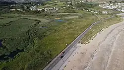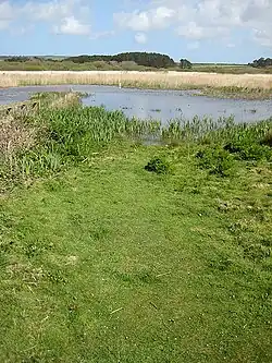 Marazion Marsh lies to the west of the town of Marazion and 3.5 kilometres (2.2 mi) east of Penzance. The marsh is in an embayed estuary and is separated from Mount's Bay by a fossilised sand and gravel barrier which (except in extreme weather conditions) prevents access to the marsh by the sea. A discontinuous and eroded sand dune system is crossed by the main Penzance to Marazion road (formally the A394).[1][2] The recent deposits sit on Lower Devonian Mylor Slates. The Red River (also known as the Marazion River) drains the Phragmites dominated marsh.
