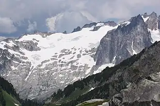 Marble Creek Glacier is in North Cascades National Park in the U.S. state of Washington. Marble Creek Glacier is at the headwaters of Marble Creek, a major tributary of the Cascade River. The glacier lies to the NNW of Dorado Needle and is also 1.20 mi (1.93 km) NNW of Eldorado Peak.[1] To the east of Marble Creek Glacier lie the much larger Inspiration and McAllister Glaciers.[2] Marble Creek Glacier descends from 8,000 to 7,000 ft (2,400 to 2,100 m).