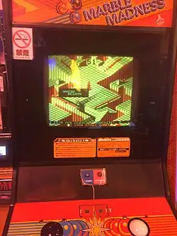 Marble Madness is a 1984 platform game designed by Mark Cerny and published by Atari Games Inc. for arcades. Set in an isometric perspective, the game tasks the player with guiding a marble through six courses, populated with obstacles and enemies, within a time limit. The player controls the marble by using a trackball. Marble Madness is known for using innovative game technologies: it was Atari's first to use the Atari System 1 hardware, the first to be programmed in the C programming language, and one of the first to use true stereo sound (previous games used either monaural sound or simulated stereo).