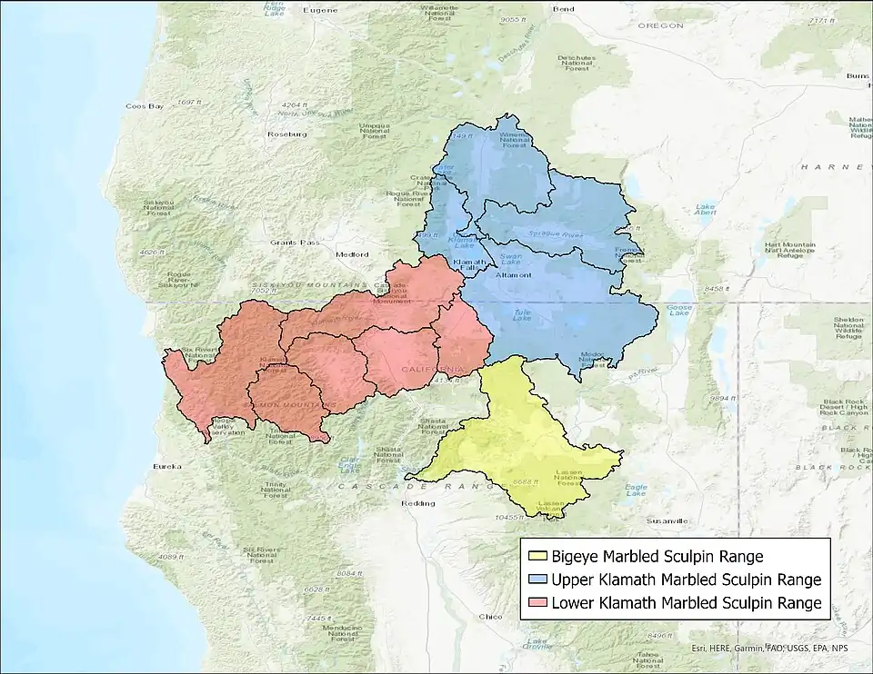 HUC8 watershed-level range map of the three marbled sculpin subspecies. Made by Harrison Morrow using ESRI ArcGIS Pro, based on data from Moyle (2002).
