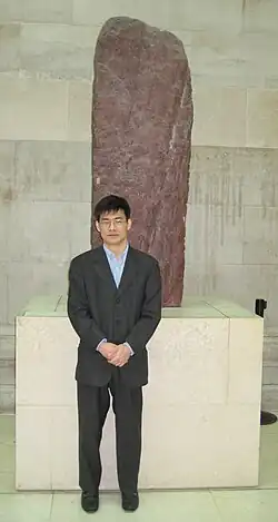 ![]() Miyake at the British Museum with an Ogham stone (February 2015) | |