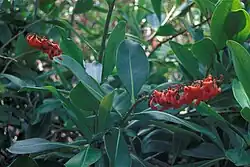 The Marcgraviaceae are a neotropical angiosperm family in the order Ericales. The members of the family are shrubs, woody epiphytes, and lianas, with alternate, pinnately nerved leaves. The flowers are arranged in racemes. The flowers are accompanied by modified, fleshy, saccate bracts which produce nectar. The flowers are pentamerous. The fruits are capsules.