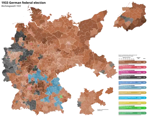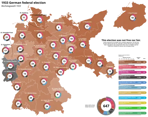 Federal elections were held in Germany on 5 March 1933, after the Nazi seizure of power on 30 January and just six days after the Reichstag fire. The election saw Nazi stormtroopers unleash a widespread campaign of violence against the Communist Party (KPD), left-wingers,[1]: 317  trade unionists, the Social Democratic Party[1] and the Centre Party.[1]: 322  They were the last multi-party elections in a united Germany until the all-German vote in 1990, though by then, the democratic process had ceased to be free or fair.