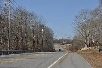 Although it is now a paved state highway, the road retains its narrow, hilly, winding character, and for most of its length, the characteristic borders of stone walls remain in place. This is the longest continuous portion of the route to survive with these physical attributes intact. This is also the only portion of the route that still offers repeated vistas of distant ridges (Photographs 3 and 4). Elsewhere, the route has been too affected by re-forestation to allow such views.[2]: 8