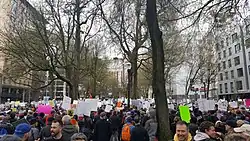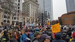 The protest was Portland's largest since the Women's March on Portland in January 2017,[19] with more than 10,000 participants.[36] The Portland Police Bureau's Traffic Division estimated 12,000 people attended.[17][25] Event organizers said there were between 20,000 and 25,000 demonstrators.[16] The Oregonian reported a crowd estimate of 12,000, and noted the presence of all age groups.[22] Willamette Week said "tens of thousands" of people were in attendance and described the crowd as "massive and diverse", consisting of "families, teachers, grandparents and groups of students of all ages".[15]