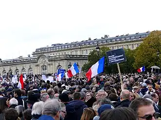Since the beginning of the surprise attack against Israel by Hamas on 7 October 2023, a growing number of acts of antisemitism have occurred in France.[1] On 7 November 2023, President of the National Assembly Yaël Braun-Pivet and President of the Senate Gérard Larcher called for the formation of a "large civil protest" against antisemitism in the Palais Bourbon and Palais Luxembourg.[2]