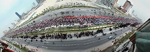 Protest organizers, which consisted of a loose coalition of seven political parties including Al Wefaq and Wa'ad,[23] named the march the largest in Bahrain's history.[17] Associated Press,[15] The Huffington Post,[24] The New York Times[17] and Voice of America[25] estimated that there were over 100,000 participants. The New York Times described the number as "astonishing", because Bahraini citizens total number was a little over 500,000.[17] The BBC described the course of march as a "sea of red and white flags".[20] Other estimates varied between 30,000 and 200,000 participants. In their documentary film Bahrain: Shouting in the Dark, Al Jazeera English stated, "Bahrain held its largest march in history; the world media recorded nearly a quarter of all citizens in the streets".[26] The BICI report mentioned that "by many accounts more than 100,000 people were marching" and that the number of protesters at Pearl Roundabout peaked at over 150,000.[2]: 88 IFEX estimated the number to be as high as 200,000; however, CNN Arabic said the number was just about 30,000.[27][28]