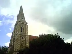 Marchwood was at one time in the parish of Eling, and is situated in that part of the ancient parish which lies low at the mouth of the River Test, southeast of Eling village.[6] Cracknore, in Marchwood, was the landing place of the ferry from Southampton long before the Hythe Ferry.[3] There was an important beacon site here at Beacon Hill, receiving and sending messages to both ends of the Isle of Wight.[3] Marchwood became a separate ecclesiastical parish in 1843, and a civil parish in 1894.[6] The church was built and endowed by Horatio Francis Kingsford Holloway in 1843.[6] By the beginning of the 20th century, there were Government gunpowder magazines and a Metropolitan Police barracks in Marchwood.[6]