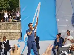 On 21 February 2009, he won the 59th Sanremo Festival in the category Artists with the song "La forza mia" written by Paolo Carta, the producer, songwriter and guitarist of Laura Pausini, winning 57.62% of the preference votes of the public[13][14] On 20 February, he published and released his third album, La forza mia. Just four days after release, La forza mia wins platinum status with over 80 thousand copies sold.[15] and debuted in third place in FIMI.[16] Two weeks after release, the album moves from third to second position in the leader FIMI.[16] His second single, "Dentro ad ogni brivido", was released in April 2009. On 16 May, Carta won the awards Man of the Year and Best No. 1 of the year, in TRL Awards 2009.[17][18] The "Marco Carta Tour 2009", which started on 30 April, had a great success with the public, to the point that some dates were canceled for being overcrowded.[19] That same year, Carta wins two Wind Music Award for discs of platinum albums achieved with Ti rincontrerò and La forza mia, plus a special prize (RTL 102.5), the Sirmione Catullo 2009 prize as the revelation of the year, and then the Venice Music Awards 2009 as the best artist of the year. On 16 September, after 5 months, the summer tour ends and on 26 September, his song "Dentro ad ogni brivido" is voted as the most representative song of summer 2009 as the MTV Coca-Cola The Summer Song.