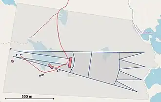 The route ran from the gate of the site over bog and rocks to the main buildings of the Marconi Wireless Station. There was a turntable at each end of the track, of which ruins are still visible. There were no passing loops on the single-line track. Several manually operated cranes along the route could be used to load the waggons with peat, which was burned as fuel by the on-site power station.[2][1]