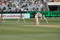 Harris made his Test debut on 6 December 2018, opening the batting alongside his Victorian teammate Aaron Finch,[27] the least experienced pair to open the batting for Australia at Test level since the 1950s.[28] He had his baggy green cap presented by Michael Hussey. Harris played in all four matches of the series against India, scoring 256 runs, including two half-centuries, at an average of 36.57,[29] and he was Australia's most consistent batsman in the 2–1 series loss,[1] but he wasn't able to score a century in any of the matches.[29] Harris then under-performed in the subsequent series against Sri Lanka, potentially putting his place in the Test team at risk for the upcoming 2019 Ashes series.[1]