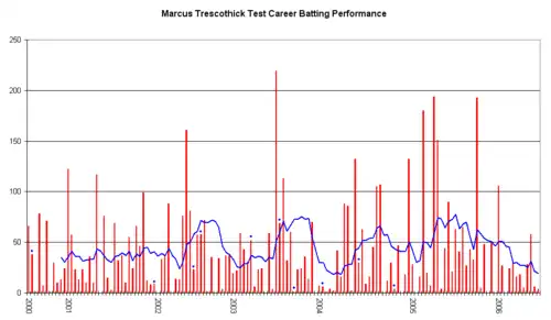 Trescothick was an automatic choice for England between 2000 and 2006, before a stress-related illness threatened his career and forced him to pull out of the national squad.[5][6] He began rebuilding his career with Somerset in 2007 and scored two double-centuries that season. However, he remained uneasy about returning to international cricket,[7][8] and announced his retirement from internationals in March 2008, opting to continue playing at county level for Somerset.[9] Media speculation continued as to a possible international return, Trescothick repeatedly voiced his intent to remain in retirement,[10] and has suffered recurrences of his condition in both 2008 and 2009 when Somerset toured abroad.[11][12] He nevertheless continued to play for Somerset[13] while also working as a commentator and analyst for Sky Sports in the off-season. He finally retired in 2019 holding several Somerset batting records. He is currently the lead batting coach for the England Test team.