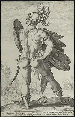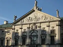 Bonfini also provided the Hunyadis with the epithet Corvinus. This was supposedly due to a case in which the tribune, Marcus Valerius Corvus in 349 BC, while on the battlefield, accepted a challenge to single combat issued to the Romans by a barbarian warrior of great size and strength. Suddenly, a raven flew from a trunk, perched upon his helmet, and began to attack his foe's eyes with its beak so fiercely that the barbarian was blinded and the Roman beat him easily. In memory of this event, Valerius' agnomen Corvinus (from Corvus, "Raven") was interpreted as derived from this event. The Hunyadis called themselves "Corvinus" and had their coins minted displaying a "raven with a ring". This was later taken up in the coat of arms of Polish aristocratic families connected with the Hunyadis, and also led to Marcus Valerius Messalla Corvinus' triumph over the Aquitanians (27 BC) being commemorated in the pediment of the Krasiński Palace in Warsaw.