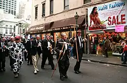 In 1830, a group of revelers, led by Michael Krafft, who was likely influenced by his Pennsylvania Swedish traditions of celebrating the New Year, stayed awake all New Year's Eve, started a dawn parade on January 1, 1831, making noise with cowbells, hoes, and rakes.[10][15] The group became the first parading mystic society, calling themselves the Cowbellion de Rakin Society, in a parody of French. They had annual parades each New Year's Eve.[2][10] Nearly 125 years after Mobile's first parade of 1711, members of the Cowbellion de Rakin Society, took their parade tradition to New Orleans in 1835, eventually forming the Mistick Krewe of Comus.[10]