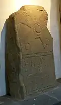 - Ogham (right side) ROL[ACU]N M[A]Q ILL[U]NA (translated as 'Rolacun son of Illuna', two Irish names)[1]