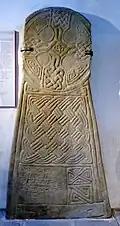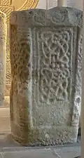 The largest of the Margam Stones, and with the most decorative and figurative carvings, the RCAHMW describe it as "the most impressive of the monuments of this category in the county, if not in all Wales".[12] It has an immense stone wheel-cross with knot-work arcs, plaitwork cross, and a central boss. The shaft includes carved figures flanking the cross, taken to be St John holding his gospel, and the virgin Mary. This is set into a massive stone pedestal block with intricate geometrical patterns and a hunting scene which would originally have formed the front, but was at some point reversed, so is now at the back of the pedestal. Both parts are made from Pennant sandstone and it has been known traditionally as 'The Sanctuary Stone'.[13][14]